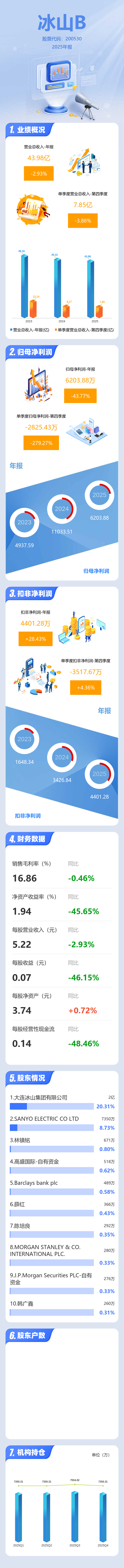 证券之星消息,冰山B2025年年报显示,当年度公司主营收入43.98亿元,同比下降2.94%;归母净利润6203.88万元,同比下降43.77%;扣非净利润4401.28万元,同比上升28.44%;其中2025年第四季度,公司单季度主营收入7.85亿元,同比下降3.86%;单季度归母净利润-2825.43万元,同比下降279.27%;单季度扣非净利润-3517.67万元,同比上升4.37%;负债率57.76%,投资收益3062.48万元,财务费用1796.61万元,毛利率16.86%。