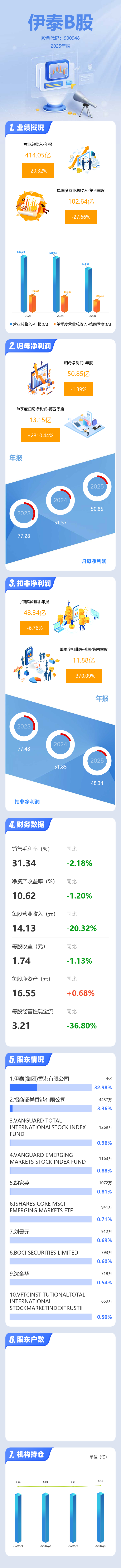 证券之星消息,伊泰B股2025年年报显示,当年度公司主营收入414.05亿元,同比下降20.33%;归母净利润50.85亿元,同比下降1.4%;扣非净利润48.34亿元,同比下降6.77%;其中2025年第四季度,公司单季度主营收入102.64亿元,同比下降27.66%;单季度归母净利润13.15亿元,同比上升2310.45%;单季度扣非净利润11.88亿元,同比上升370.09%;负债率44.21%,投资收益12.77亿元,财务费用5.3亿元,毛利率31.34%。