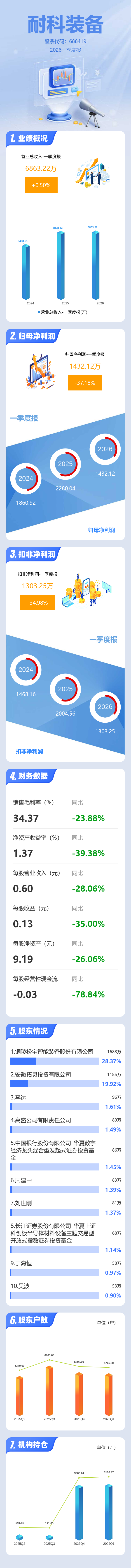 证券之星消息,耐科装备2026年一季报显示,一季度公司主营收入6863.22万元,同比上升0.51%;归母净利润1432.12万元,同比下降37.19%;扣非净利润1303.25万元,同比下降34.99%;负债率15.1%,投资收益146.43万元,财务费用100.2万元,毛利率34.37%。