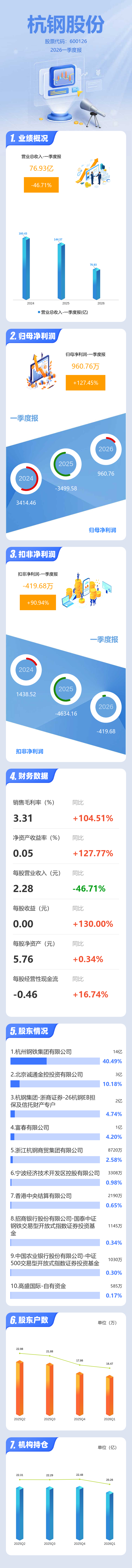 证券之星消息,杭钢股份2026年一季报显示,一季度公司主营收入76.93亿元,同比下降46.71%;归母净利润960.76万元,同比上升127.45%;扣非净利润-419.68万元,同比上升90.94%;负债率33.66%,投资收益787.15万元,财务费用-1518.95万元,毛利率3.31%。
