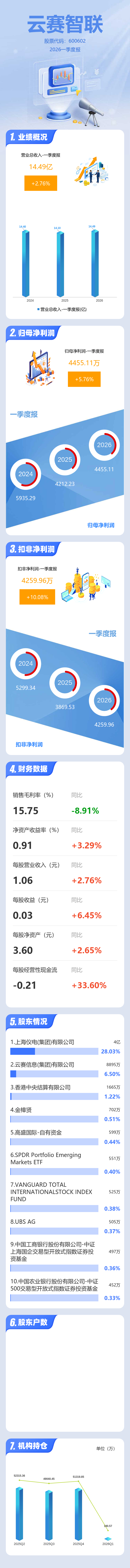 证券之星消息,云赛智联2026年一季报显示,一季度公司主营收入14.49亿元,同比上升2.76%;归母净利润4455.11万元,同比上升5.77%;扣非净利润4259.96万元,同比上升10.09%;负债率42.31%,投资收益122.95万元,财务费用-1710.38万元,毛利率15.74%。