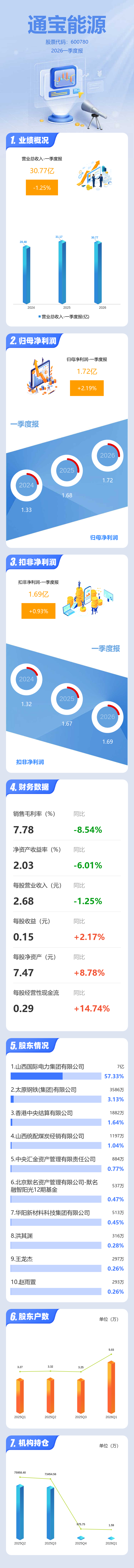 证券之星消息,通宝能源2026年一季报显示,一季度公司主营收入30.77亿元,同比下降1.26%;归母净利润1.72亿元,同比上升2.19%;扣非净利润1.69亿元,同比上升0.93%;负债率29.92%,投资收益4734.99万元,财务费用380.49万元,毛利率7.78%。