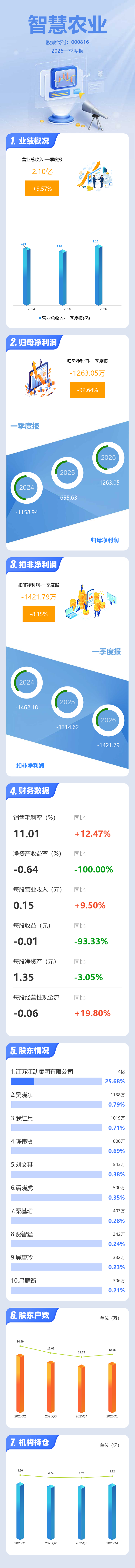 证券之星消息,智慧农业2026年一季报显示,一季度公司主营收入2.1亿元,同比上升9.57%;归母净利润-1263.05万元,同比下降92.65%;扣非净利润-1421.79万元,同比下降8.15%;负债率23.68%,投资收益108.44万元,财务费用166.84万元,毛利率11.01%。