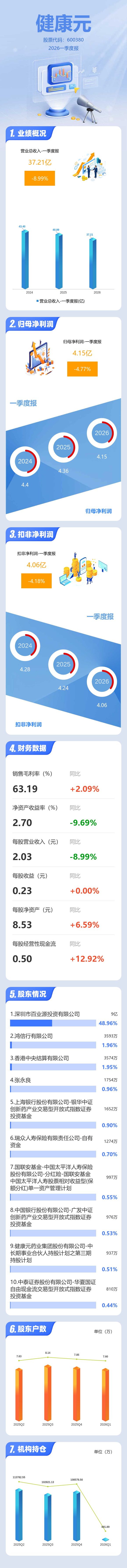 证券之星消息,健康元2026年一季报显示,一季度公司主营收入37.21亿元,同比下降8.99%;归母净利润4.15亿元,同比下降4.78%;扣非净利润4.06亿元,同比下降4.18%;负债率30.86%,投资收益4903.07万元,财务费用-1421.08万元,毛利率63.19%。