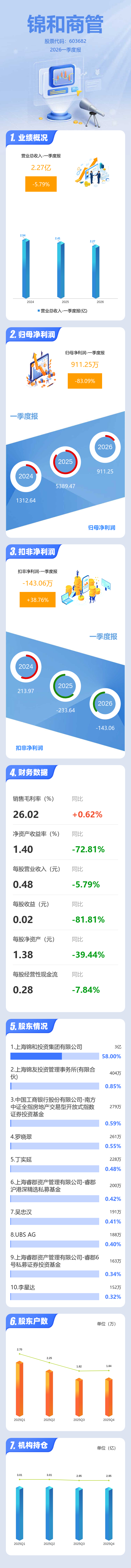 证券之星消息,锦和商管2026年一季报显示,一季度公司主营收入2.27亿元,同比下降5.79%;归母净利润911.25万元,同比下降83.09%;扣非净利润-143.06万元,同比上升38.77%;负债率85.56%,投资收益33.71万元,财务费用3656.32万元,毛利率26.02%。