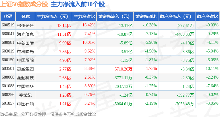 资金流向方面,上证50(000016)指数成份股当日主力资金净流入合计34.93亿元,游资资金净流出合计36.24亿元,散户资金净流入合计1.31亿元。成份股资金流向详情见下表: