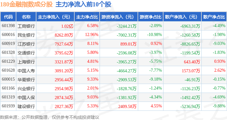 资金流向方面,180金融(000018)指数成份股当日主力资金净流出合计3.31亿元,游资资金净流出合计1.65亿元,散户资金净流入合计4.96亿元。成份股资金流向详情见下表: