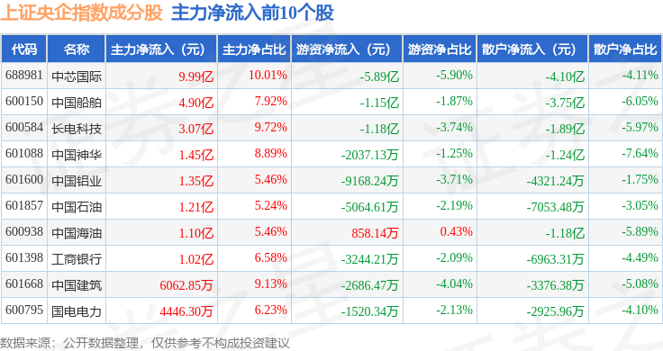 资金流向方面,上证央企(000042)指数成份股当日主力资金净流出合计6.84亿元,游资资金净流出合计3.92亿元,散户资金净流入合计10.76亿元。成份股资金流向详情见下表: