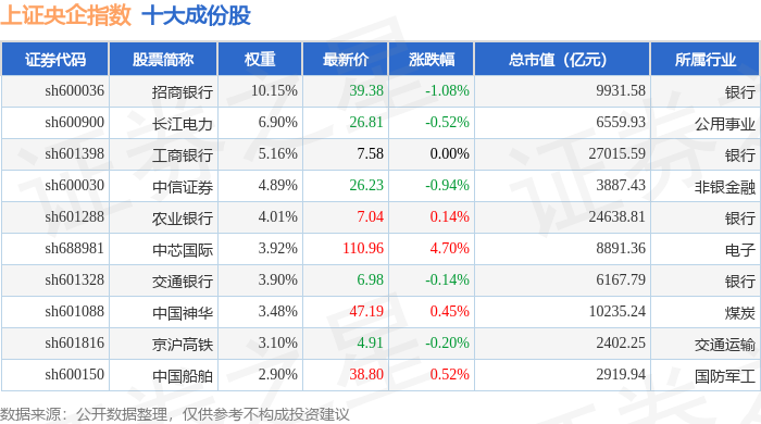 上证央企(000042)指数十大成份股详情如下: