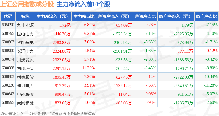 资金流向方面,上证公用(000041)指数成份股当日主力资金净流出合计11.58亿元,游资资金净流入合计3.82亿元,散户资金净流入合计7.75亿元。成份股资金流向详情见下表: