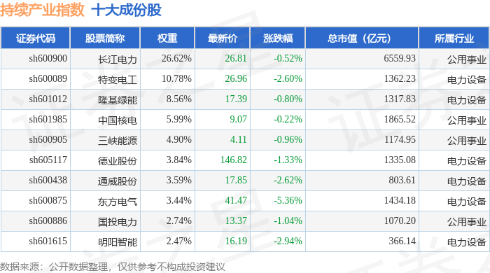 证券之星消息,4月24日,持续产业(000114)指数报收于1325.47点,跌1.29%,成交330.05亿元,换手率1.46%。当日该指数成份股中,上涨的有6家,聚和材料以3.11%的涨幅领涨,下跌的有32家,东方电气以5.36%的跌幅领跌。