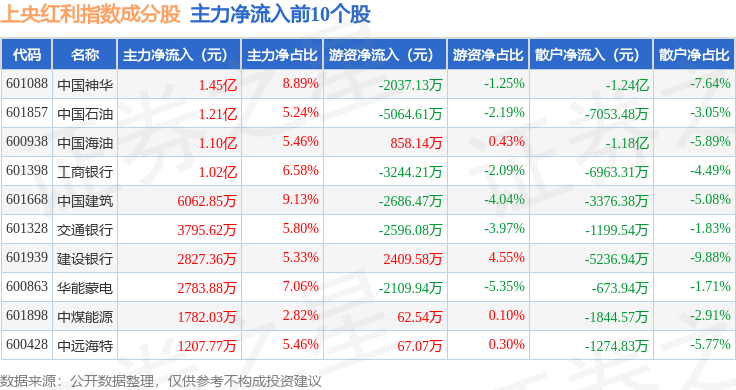资金流向方面,上央红利(000152)指数成份股当日主力资金净流入合计1689.11万元,游资资金净流入合计1.41亿元,散户资金净流出合计1.58亿元。成份股资金流向详情见下表: