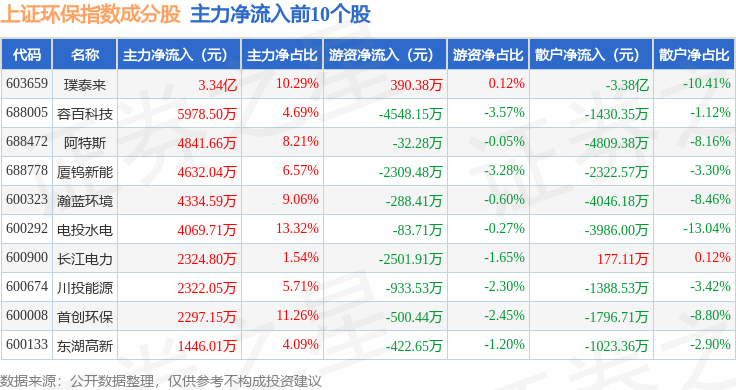 资金流向方面,上证环保(000158)指数成份股当日主力资金净流出合计19.44亿元,游资资金净流入合计2.48亿元,散户资金净流入合计16.95亿元。成份股资金流向详情见下表:
