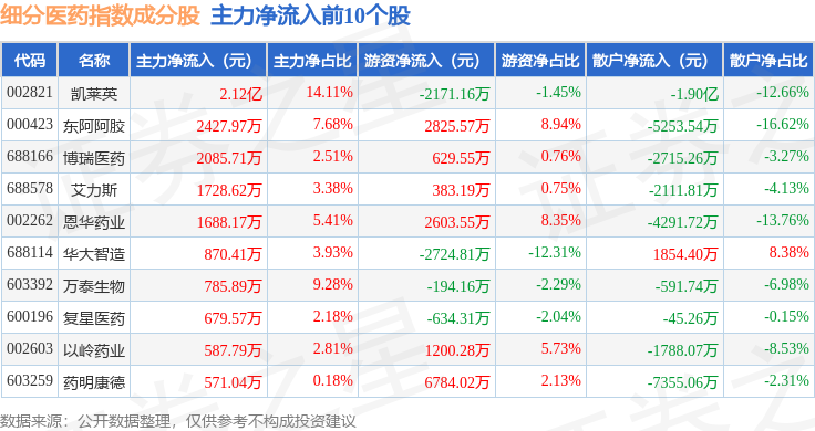资金流向方面,细分医药(000814)指数成份股当日主力资金净流出合计4.46亿元,游资资金净流入合计3.71亿元,散户资金净流入合计7482.42万元。成份股资金流向详情见下表: