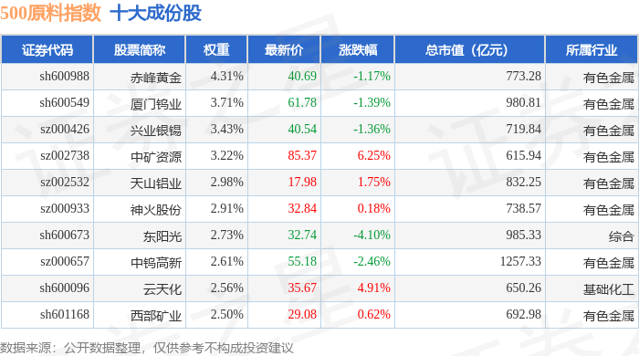 500原料(000854)指数十大成份股详情如下: