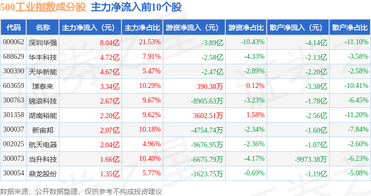 资金流向方面,500工业(000856)指数成份股当日主力资金净流出合计29.37亿元,游资资金净流入合计2.91亿元,散户资金净流入合计26.46亿元。成份股资金流向详情见下表: