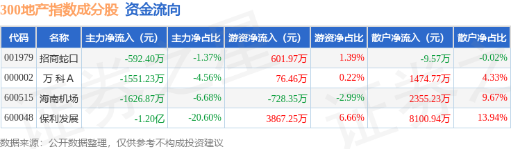 资金流向方面,300地产(000952)指数成份股当日主力资金净流出合计1.57亿元,游资资金净流入合计3817.33万元,散户资金净流入合计1.19亿元。成份股资金流向详情见下表: