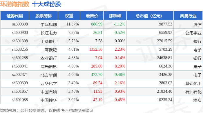 证券之星消息,4月24日,环渤海(399357)指数报收于3818.6点,涨0.21%,成交1091.67亿元,换手率0.21%。当日该指数成份股中,上涨的有9家,海光信息以8.2%的涨幅领涨,下跌的有29家,恒力石化以2.82%的跌幅领跌。