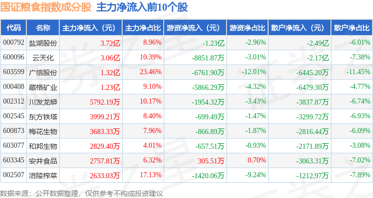 资金流向方面,国证粮食(399365)指数成份股当日主力资金净流入合计10.31亿元,游资资金净流出合计2.54亿元,散户资金净流出合计8.17亿元。成份股资金流向详情见下表: