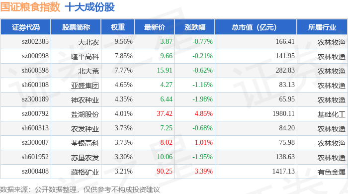 证券之星消息,4月24日,国证粮食(399365)指数报收于13984.61点,涨0.33%,成交227.85亿元,换手率2.16%。当日该指数成份股中,上涨的有27家,广信股份以10.01%的涨幅领涨,下跌的有23家,秋乐种业以8.11%的跌幅领跌。