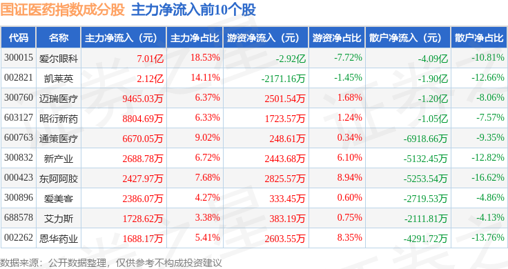 资金流向方面,国证医药(399394)指数成份股当日主力资金净流出合计2.48亿元,游资资金净流入合计2.37亿元,散户资金净流入合计620.91万元。成份股资金流向详情见下表: