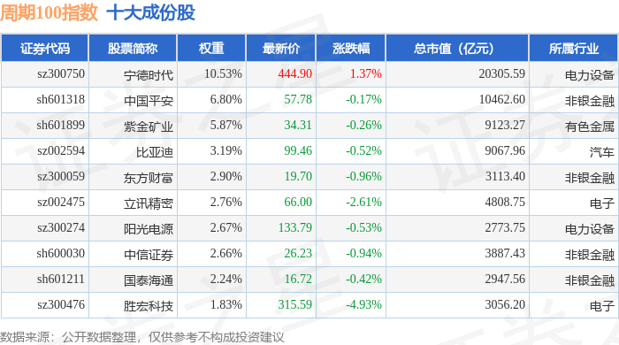 证券之星消息,4月24日,周期100(399402)指数报收于3919.42点,跌0.22%,成交2502.4亿元,换手率0.8%。当日该指数成份股中,上涨的有26家,天齐锂业以8.43%的涨幅领涨,下跌的有72家,鹏鼎控股以5.08%的跌幅领跌。