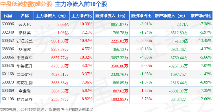 资金流向方面,中盘低波(399406)指数成份股当日主力资金净流出合计8.11亿元,游资资金净流入合计7.04亿元,散户资金净流入合计1.08亿元。成份股资金流向详情见下表: