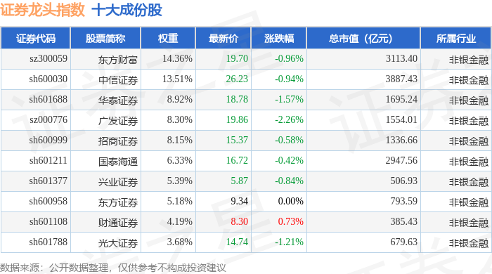 资金流向方面,证券龙头(399437)指数成份股当日主力资金净流出合计6.66亿元,游资资金净流入合计1.18亿元,散户资金净流入合计5.48亿元。成份股资金流向详情见下表: