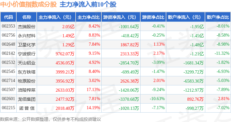 资金流向方面,中小价值(399604)指数成份股当日主力资金净流出合计22.96亿元,游资资金净流入合计6.09亿元,散户资金净流入合计16.86亿元。成份股资金流向详情见下表: