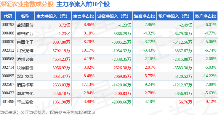 资金流向方面,深证农业(399669)指数成份股当日主力资金净流入合计3.82亿元,游资资金净流入合计9510.29万元,散户资金净流出合计4.78亿元。成份股资金流向详情见下表: