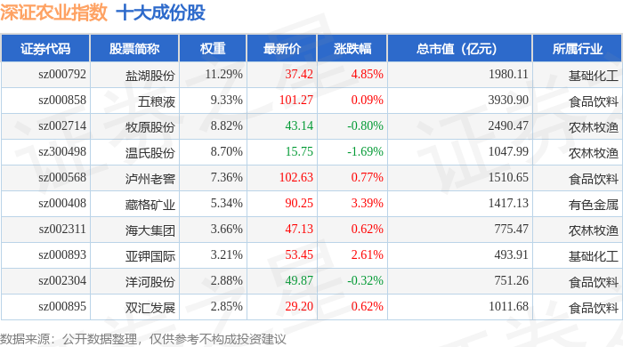 证券之星消息,4月24日,深证农业(399669)指数报收于8234.11点,涨0.51%,成交226.49亿元,换手率1.46%。当日该指数成份股中,上涨的有20家,鲁西化工以5.32%的涨幅领涨,下跌的有29家,中粮科技以6.08%的跌幅领跌。