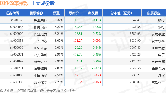 国企改革(399974)指数十大成份股详情如下: