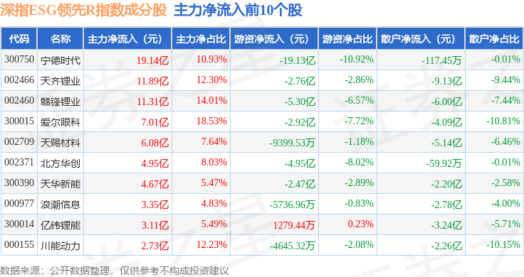 资金流向方面,深指ESG领先R(470029)指数成份股当日主力资金净流出合计74.23亿元,游资资金净流入合计17.63亿元,散户资金净流入合计56.6亿元。成份股资金流向详情见下表: