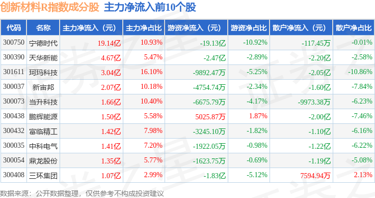 资金流向方面,创新材料R(470039)指数成份股当日主力资金净流入合计16.16亿元,游资资金净流出合计24.15亿元,散户资金净流入合计7.99亿元。成份股资金流向详情见下表: