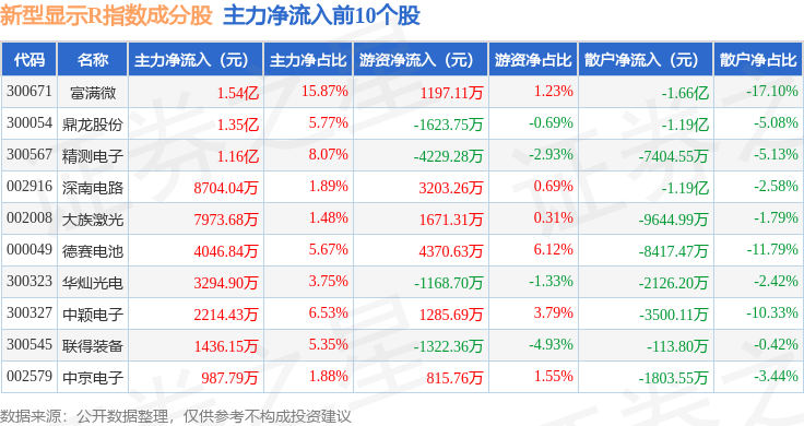 资金流向方面,新型显示R(470048)指数成份股当日主力资金净流出合计63.98亿元,游资资金净流入合计16.21亿元,散户资金净流入合计47.77亿元。成份股资金流向详情见下表: