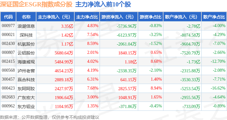 资金流向方面,深证国企ESGR(470055)指数成份股当日主力资金净流出合计9.4亿元,游资资金净流入合计6.77亿元,散户资金净流入合计2.63亿元。成份股资金流向详情见下表: