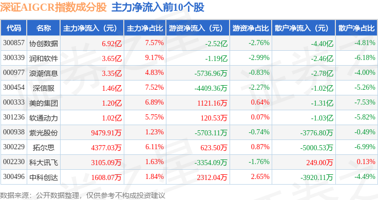 资金流向方面,深证AIGCR(470075)指数成份股当日主力资金净流出合计12.18亿元,游资资金净流入合计2026.7万元,散户资金净流入合计11.98亿元。成份股资金流向详情见下表: