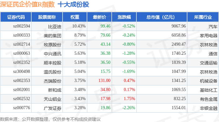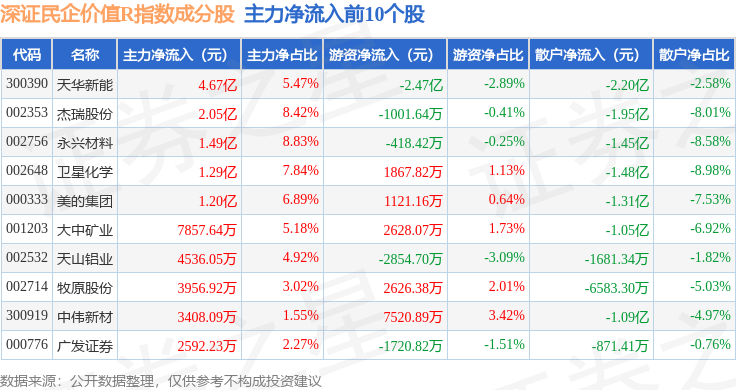 资金流向方面,深证民企价值R(470072)指数成份股当日主力资金净流出合计7.29亿元,游资资金净流入合计5.77亿元,散户资金净流入合计1.51亿元。成份股资金流向详情见下表: