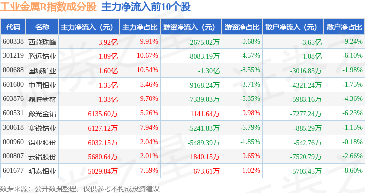 资金流向方面,工业金属R(480043)指数成份股当日主力资金净流出合计9.69亿元,游资资金净流出合计7.67亿元,散户资金净流入合计17.36亿元。成份股资金流向详情见下表: