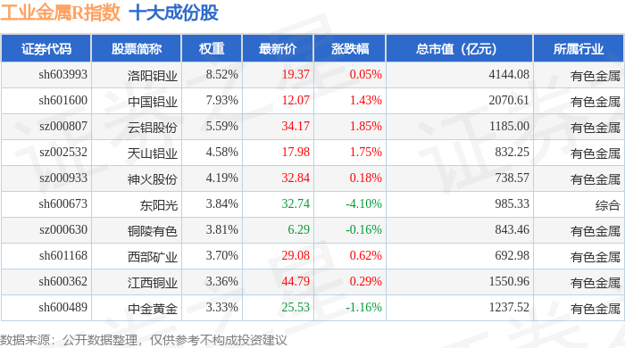 工业金属R(480043)指数十大成份股详情如下: