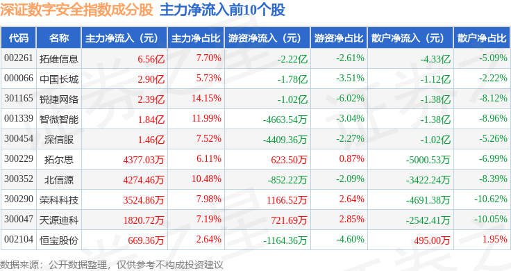 资金流向方面,深证数字安全(970052)指数成份股当日主力资金净流出合计9.55亿元,游资资金净流出合计3.81亿元,散户资金净流入合计13.36亿元。成份股资金流向详情见下表: