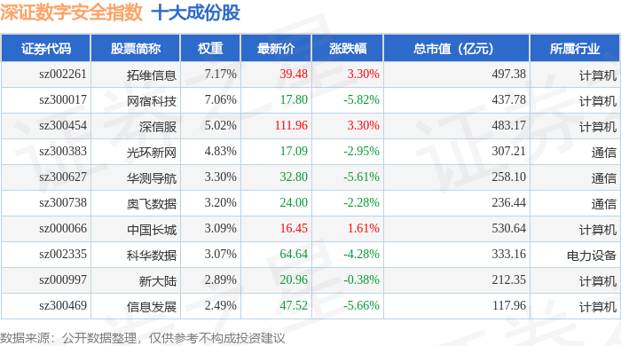 证券之星消息,4月24日,深证数字安全(970052)指数报收于3465.3点,跌1.0%,成交491.61亿元,换手率5.01%。当日该指数成份股中,上涨的有12家,智微智能以10.0%的涨幅领涨,下跌的有37家,深城交以7.43%的跌幅领跌。