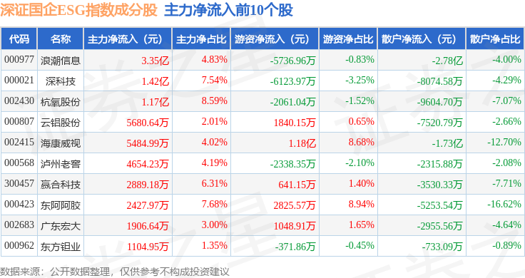资金流向方面,深证国企ESG(970055)指数成份股当日主力资金净流出合计9.4亿元,游资资金净流入合计6.77亿元,散户资金净流入合计2.63亿元。成份股资金流向详情见下表: