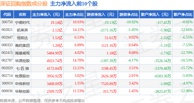 资金流向方面,深证回购(970063)指数成份股当日主力资金净流入合计18.73亿元,游资资金净流出合计16.57亿元,散户资金净流出合计2.16亿元。成份股资金流向详情见下表: