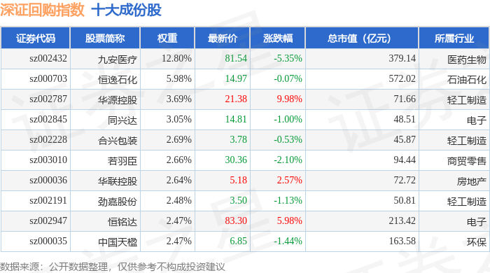 深证回购(970063)指数十大成份股详情如下: