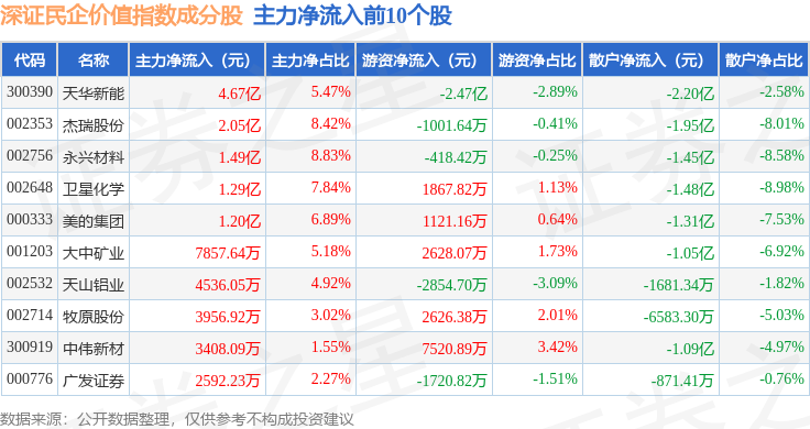 资金流向方面,深证民企价值(970072)指数成份股当日主力资金净流出合计7.29亿元,游资资金净流入合计5.77亿元,散户资金净流入合计1.51亿元。成份股资金流向详情见下表: