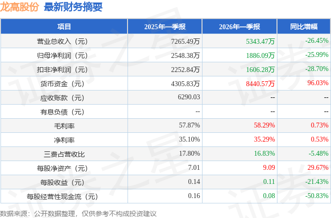 据证券之星公开数据整理,近期龙高股份(605086)发布2026年一季报。截至本报告期末,公司营业总收入5343.47万元,同比下降26.45%,归母净利润1886.09万元,同比下降25.99%。按单季度数据看,第一季度营业总收入5343.47万元,同比下降26.45%,第一季度归母净利润1886.09万元,同比下降25.99%。本报告期龙高股份盈利能力上升,毛利率同比增幅0.73%,净利率同比增幅0.53%。
