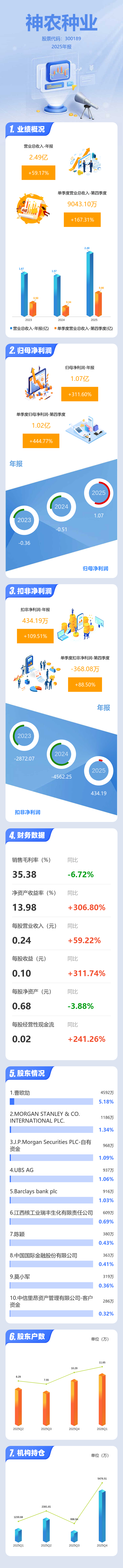 证券之星消息,神农种业2025年年报显示,当年度公司主营收入2.49亿元,同比上升59.18%;归母净利润1.07亿元,同比上升311.61%;扣非净利润434.19万元,同比上升109.52%;其中2025年第四季度,公司单季度主营收入9043.1万元,同比上升167.32%;单季度归母净利润1.02亿元,同比上升444.78%;单季度扣非净利润-368.08万元,同比上升88.5%;负债率38.92%,投资收益1.41亿元,财务费用316.53万元,毛利率35.38%。