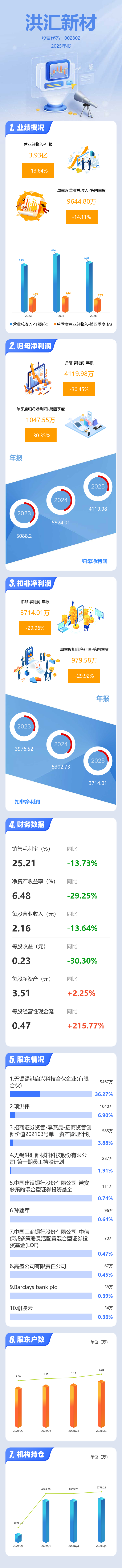 证券之星消息,洪汇新材2025年年报显示,当年度公司主营收入3.93亿元,同比下降13.64%;归母净利润4119.98万元,同比下降30.45%;扣非净利润3714.01万元,同比下降29.96%;其中2025年第四季度,公司单季度主营收入9644.8万元,同比下降14.12%;单季度归母净利润1047.55万元,同比下降30.36%;单季度扣非净利润979.58万元,同比下降29.93%;负债率7.6%,投资收益323.15万元,财务费用-78.43万元,毛利率25.21%。