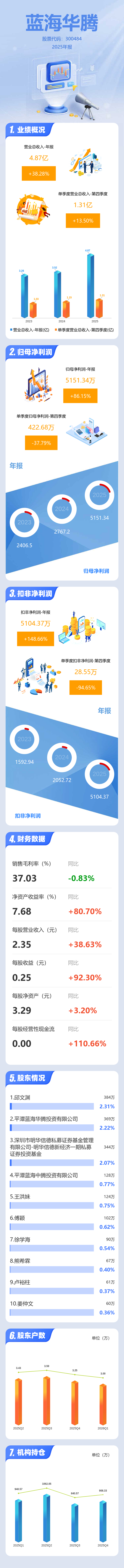 证券之星消息,蓝海华腾2025年年报显示,当年度公司主营收入4.87亿元,同比上升38.29%;归母净利润5151.34万元,同比上升86.16%;扣非净利润5104.37万元,同比上升148.66%;其中2025年第四季度,公司单季度主营收入1.31亿元,同比上升13.51%;单季度归母净利润422.68万元,同比下降37.79%;单季度扣非净利润28.55万元,同比下降94.66%;负债率28.75%,投资收益270.47万元,财务费用-136.54万元,毛利率37.03%。
